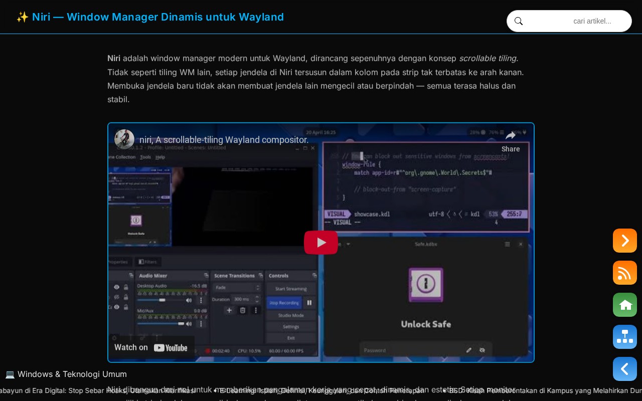 Niri adalah window manager modern untuk Wayland, dirancang sepenuhnya dengan konsep scrollable tiling. Tidak seperti tiling WM lain, setiap jendela di Niri tersusun dalam kolom pada strip tak terbatas ke arah kanan. Membuka jendela baru tidak akan membuat jendela lain mengecil atau berpindah — semua terasa halus dan stabil.